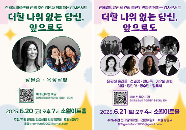 더할 나위 없는 당신께 앞으로의 동행을 제안하며 감사콘서트 초대장을 보냅니다. 2025년 6월, 전태일의료센터 건립 추진위원들과 한자리에 모이는 시간을 마련했습니다. 가수 장필순, 옥상달빛과 함께하는 1일차 공연은 아쉽지만 예매가 마감되었고요. “새로운 시대, 다시 부르는 민중가요 - 새노래 프로젝트” 참여 가수들로 엮은 2일차 공연은 예매가 한창입니다. 2024년 겨울과 2025년 상반기, 응원봉을 비추며 연대했던 시간을 기억하시죠? 2일차 공연은 새로운 광장 문화 속 다시 부를 수 있는 민중가요를 찾자는 민주노총의 <새노래 프로젝트> 앨범에 참여한 가수들 전원을 만나볼 수 있는 공연입니다. 포크, 록, 재즈 등 다양한 장르에서 주목받는 새로운 시대의 ‘민중가수’들을 감사콘서트에서 만나보세요. |