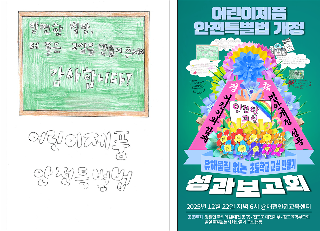 녹색병원 노동환경건강연구소는 화학물질을 비롯한 유해요인으로부터 가정과 학교, 일터와 지역을 안전하게 지켜내는 활동을 수행하고 있는데요. 그 대표적 사업이 ‘유자학교(유해물질로부터 자유로운 건강한 학교)’입니다. 유자학교는 학교의 구성원(학생, 교사, 학부모)들이 안전한 환경에서 교육받을 권리를 인식하고, 실질적인 변화를 만들어 갈 수 있도록 교육과 캠페인 활동을 지원하는 사업입니다. 2020년부터 시작된 유자학교 활동으로 학내 유해물질 조사와 개선활동을 펼치던 중 교실 게시판이나 칠판, 사물함에 기준치 이상의 발암물질이 들어있음을 확인하였는데요. 어린이들이 처음 제안해 만든 법으로 유명한 ‘어린이제품안전특별법’이 미처 보호하지 못하는 법률상의 미비점이 발견된 거죠. 이후 초등학교 교구(칠판, 게시판 등)를 어린이제품 안전관리 대상에 포함시켜 안전 사각지대를 해소하고, 해외직구 어린이제품의 안전관리 근거를 마련하는 등 어린이제품안전특별법을 개정하는 안이 준비되었습니다. 초등학생들도 법 개정 운동에 나섰어요. 사회 시간에는 교실 속 유해 물질 조사 활동을 펼쳤고, 국어 시간에는 국회의원들에게 법 개정을 요청하는 편지를 쓰는 등 주제중심 통합학습을 해나갔습니다. 어린이제품안전특별법 개정안은 장철민 국회의원의 대표발의로 2025년 11월 13일 국회 본회의를 통과하였습니다.