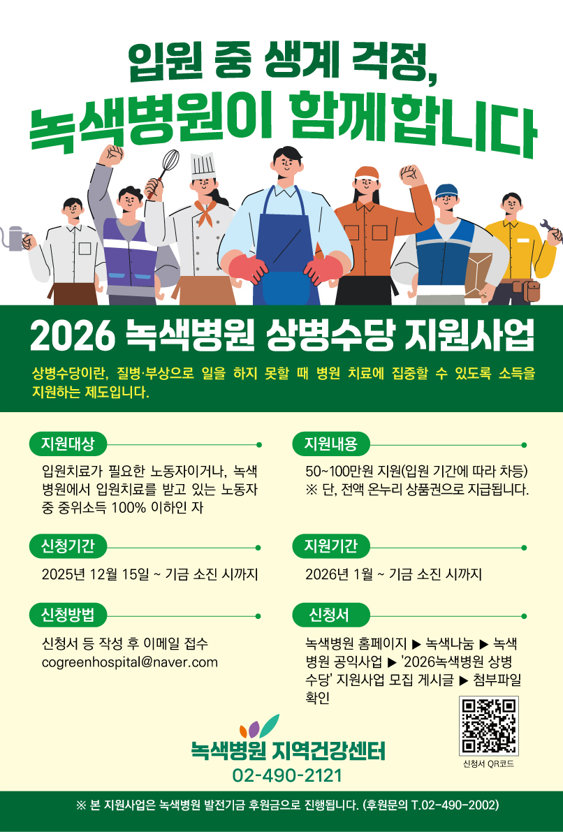 ☑ 녹색병원은 여러분이 후원해 주신 발전기금으로 제때 제대로 치료받지 못하는 분들의 치료와 입원 중 생계 걱정을 덜 수 있도록 함께 고민합니다. <2026 녹색병원 상병수당 지원사업>을 자세히 살펴보시고 지원이 필요한 분들과 연결될 수 있도록 널리 알려주세요.