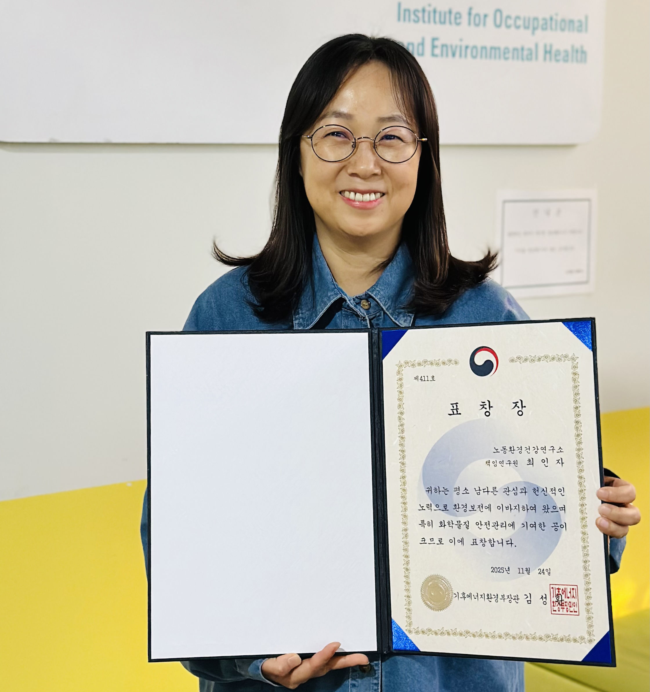 환경부(기후에너지환경부)는 매년 ‘화학안전주간’을 개최하여 민간, 공기업 등 각 분야별로 화학안전 활동을 열심히 수행한 분들에게 표창을 수여하고 있습니다. 올해 제6회 화학안전주간에서는 노동환경건강연구소 최인자 책임연구원이 시민단체 추천으로 장관상을 수상하였습니다.